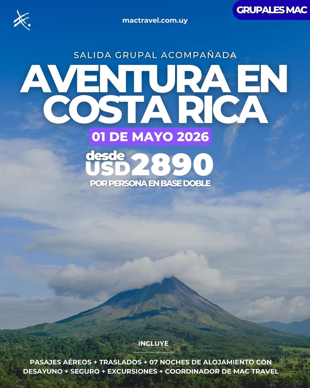 Descubrí la naturaleza exuberante de Costa Rica: volcanes imponentes, playas paradisíacas y la increíble biodiversidad de Tortuguero, Monteverde y Manuel Antonio. Salida acompañada desde Montevideo el 1 de mayo de 2026.